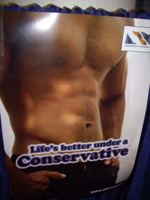 It's a reference to the "Life's better under a conservative" poster, which is clearly positioning itself as "conservatives are better in bed" and being conservatives the man would very likely be the one doing the screwing.